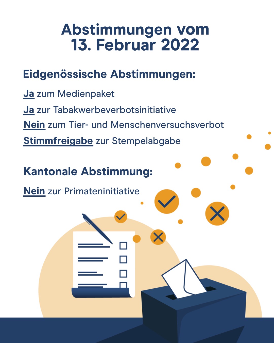 Februar 2022 stimmen die Schweizer Stimmberechtigten über die Volksinitiative Ja zum TierundMenschenversuchsverbot Ja zu Forschungswegenmit Impulsen für Sicherheitund Fortschritt. Das Referendum will nicht dass kleine Medien mehr Geld erhalten als grosse Medien. Januar 2022 - 1442 publiziert 13.